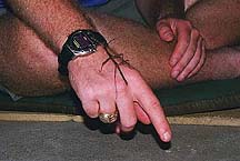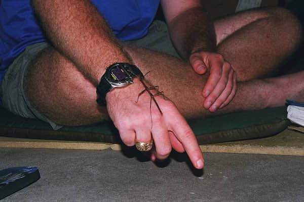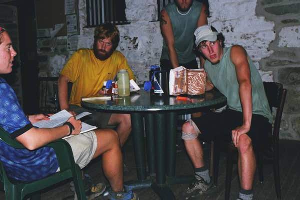 Owners John and Linda allow hikers to stay here. The photo shows a walking stick on Captain's hand.