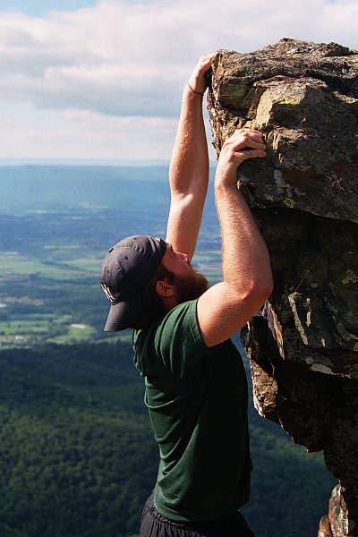 Just doing a little rock climbing. Okay, so he's standing on something.
